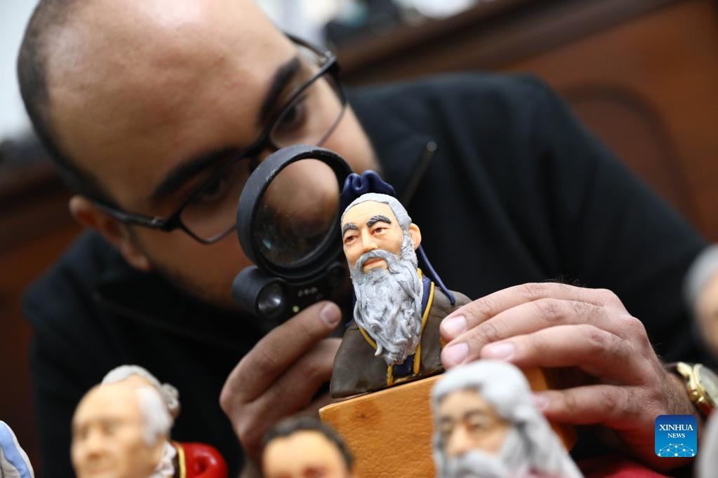 Egyptian artist Fady Francis examines his handmade miniature bust of China's philosopher Confucius at his workshop in Cairo, Egypt, on Jan. 2, 2022. On a table in downtown Cairo, Fady Francis, 30, aligns miniature sculptures of 100 influential world figures, standing side by side in harmony, although the figures were from different cultures, spoke different languages and lived in different eras in history. (Xinhua/Ahmed Gomaa)
