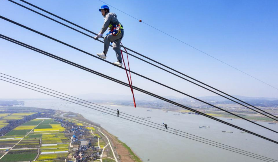 At a height of up to 280 meters over the Yangtze River in Chizhou, east China's Anhui Province, a team of utility technicians recently carried out an overhaul for the Lingzhou-Shaoxing 800-kilovolt direct current transmission line.