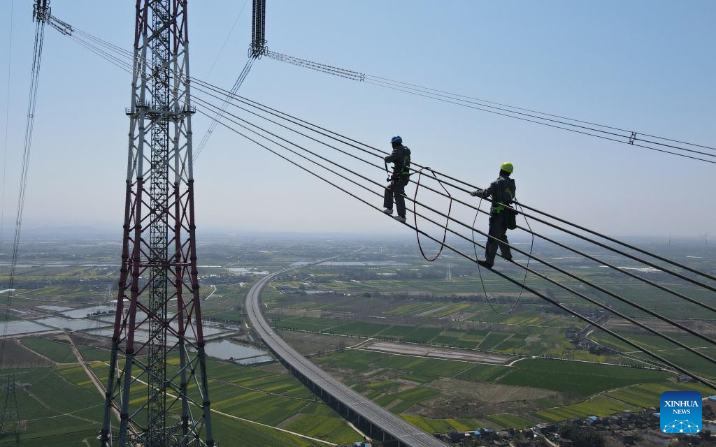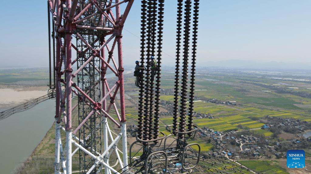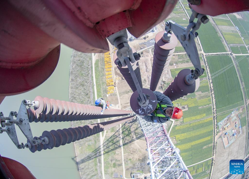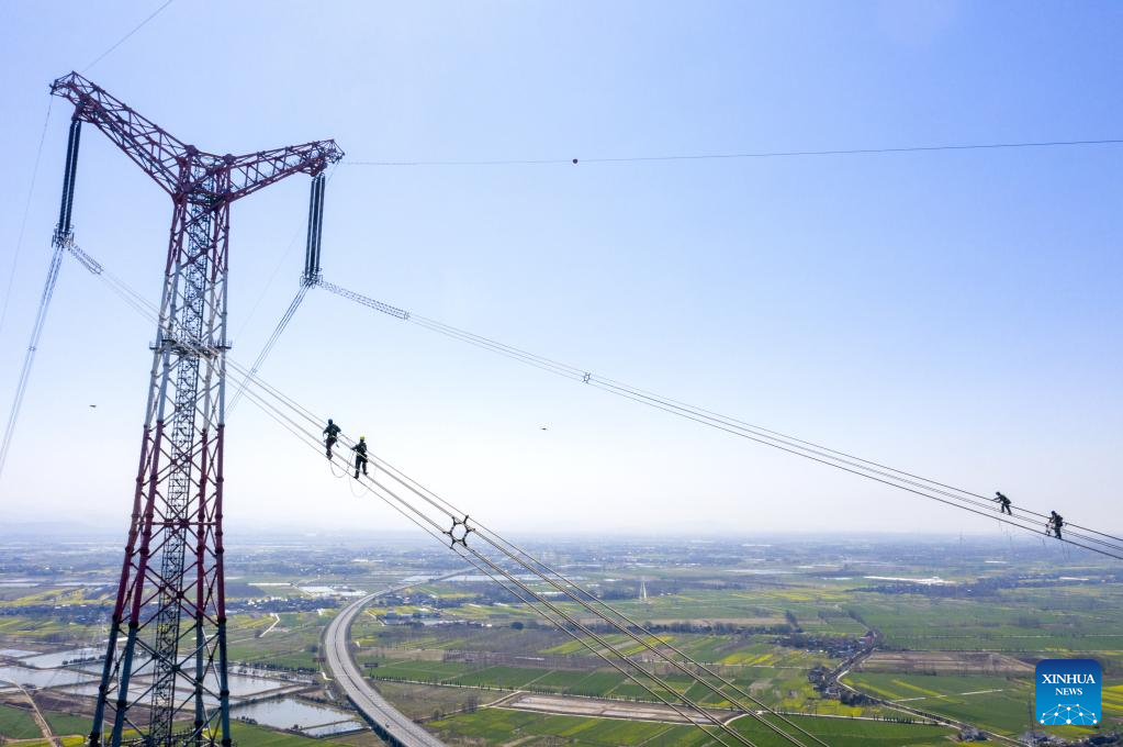 Electricians work on the Lingzhou-Shaoxing 800-kilovolt direct current transmission line over the Yangtze River in Chizhou, east China's Anhui Province, March 10, 2022.
