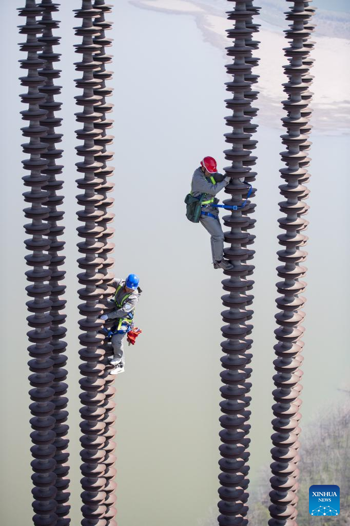 Electricians work on the Lingzhou-Shaoxing 800-kilovolt direct current transmission line over the Yangtze River in Chizhou, east China's Anhui Province, March 10, 2022. At a height of up to 280 meters over the Yangtze River in Chizhou, east China's Anhui Province, a team of utility technicians recently carried out an overhaul for the Lingzhou-Shaoxing 800-kilovolt direct current transmission line.