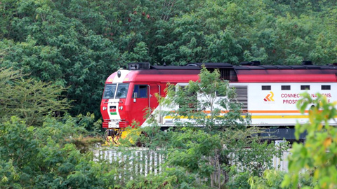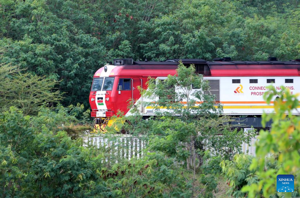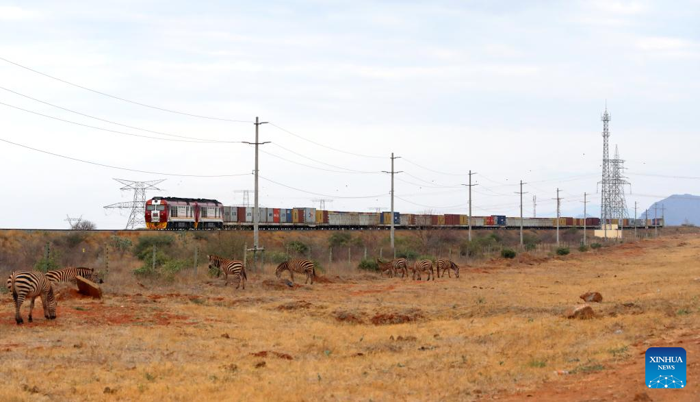 A freight train runs on the Mombasa-Nairobi Railway track in Mombasa, Kenya, on July 27, 2022. The Chinese-built Mombasa-Nairobi Standard Gauge Railway (SGR) has just celebrated its fifth anniversary of safe operation. The Mombasa-Nairobi Railway passes through nature reserves such as the Nairobi National Park and Tsavo National Park. In order to reduce the impact on the environment, a series of measures have been taken during the design and construction of the railway such as bypassing the mangroves, which help keep the mangroves flourishing in the last five years. Besides, a total of 14 large wildlife passages and 79 bridges have been set up along the entire railway in consideration of the living habits and migration paths of wild animals. Large animal passages with the height of over 6.5 meters were constructed beneath the track for large animals such as elephants and giraffes to get through. Fences are set up on both sides of the line to prevent animals from passing through and reduce the chance of collisions between animals and trains. (Xinhua/Dong Jianghui)