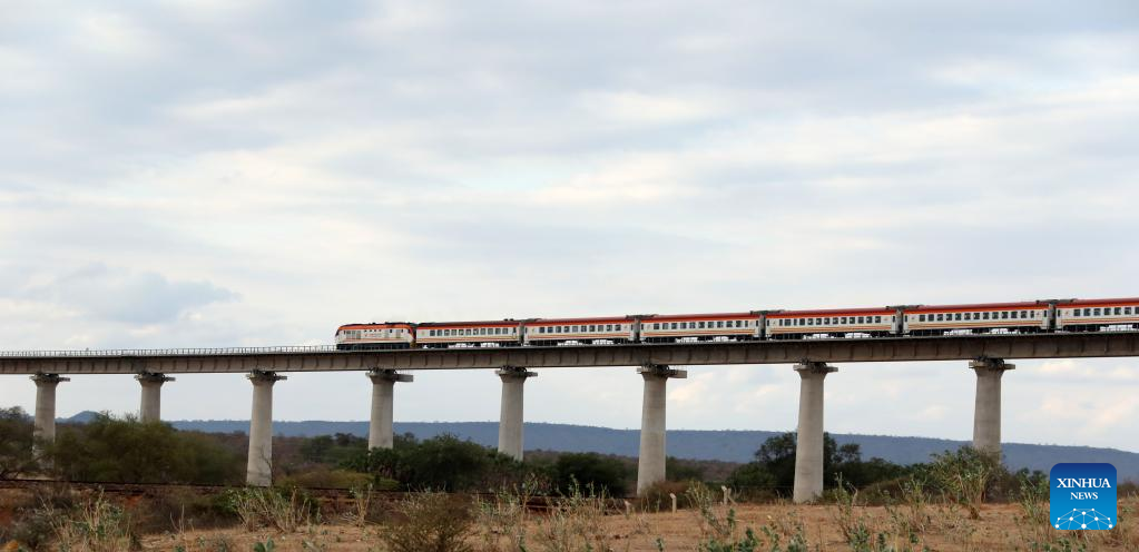 A passenger train runs on the Tsavo River Super Major Bridge near the Tsavo National Park in Kenya, on July 28, 2022. The Chinese-built Mombasa-Nairobi Standard Gauge Railway (SGR) has just celebrated its fifth anniversary of safe operation. The Mombasa-Nairobi Railway passes through nature reserves such as the Nairobi National Park and Tsavo National Park. In order to reduce the impact on the environment, a series of measures have been taken during the design and construction of the railway such as bypassing the mangroves, which help keep the mangroves flourishing in the last five years. Besides, a total of 14 large wildlife passages and 79 bridges have been set up along the entire railway in consideration of the living habits and migration paths of wild animals. Large animal passages with the height of over 6.5 meters were constructed beneath the track for large animals such as elephants and giraffes to get through. Fences are set up on both sides of the line to prevent animals from passing through and reduce the chance of collisions between animals and trains. (Xinhua/Dong Jianghui)