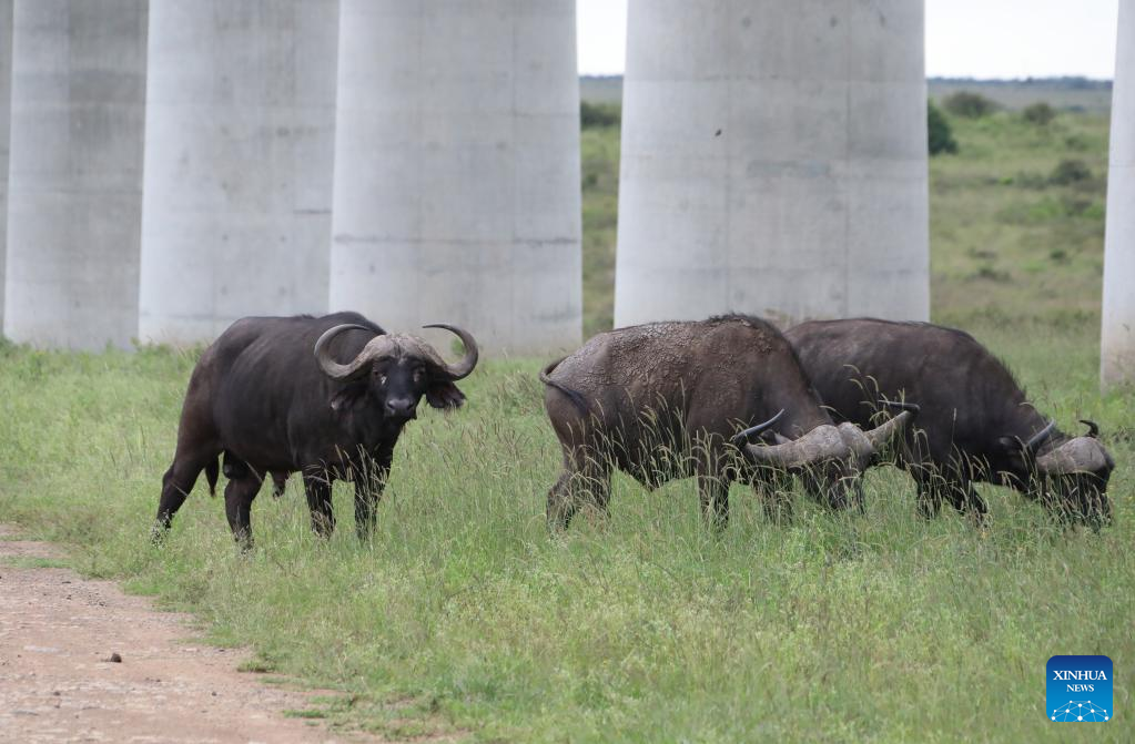 Several buffaloes are seen under the Nairobi National Park Super Major Bridge equipped with noise deflectors in Nairobi, Kenya, on May 19, 2021. The Chinese-built Mombasa-Nairobi Standard Gauge Railway (SGR) has just celebrated its fifth anniversary of safe operation. The Mombasa-Nairobi Railway passes through nature reserves such as the Nairobi National Park and Tsavo National Park. In order to reduce the impact on the environment, a series of measures have been taken during the design and construction of the railway such as bypassing the mangroves, which help keep the mangroves flourishing in the last five years. Besides, a total of 14 large wildlife passages and 79 bridges have been set up along the entire railway in consideration of the living habits and migration paths of wild animals. Large animal passages with the height of over 6.5 meters were constructed beneath the track for large animals such as elephants and giraffes to get through. Fences are set up on both sides of the line to prevent animals from passing through and reduce the chance of collisions between animals and trains. (Xinhua/Dong Jianghui)