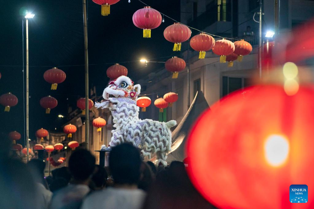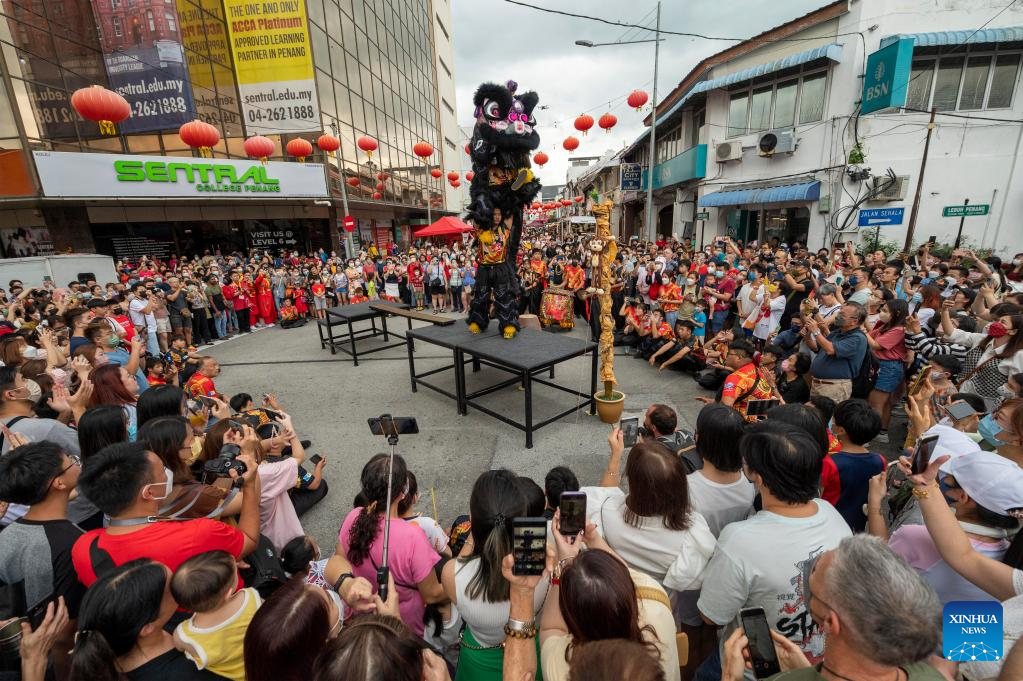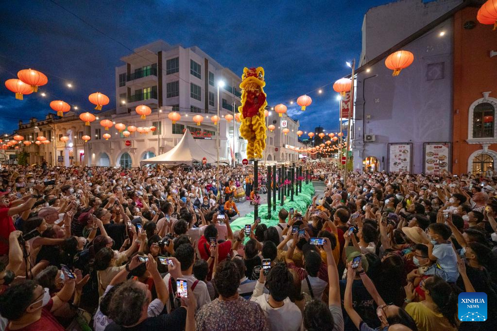 Artists perform lion dance at the Penang Chinese New Year Celebration in George Town, Penang, Malaysia, Jan. 28, 2023. (Photo by Chong Voon Chung/Xinhua)