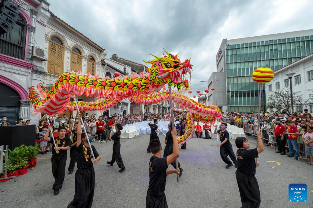 Artists perform dragon dance at the Penang Chinese New Year Celebration in George Town, Penang, Malaysia, Jan. 28, 2023. (Photo by Chong Voon Chung/Xinhua)