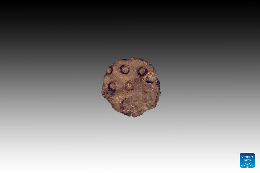 This file photo taken on Dec. 18, 2022 shows an engraved pottery shard unearthed from the Sitai ruins in Shangyi County, north China's Hebei Province. China on Wednesday announced milestone archaeological discoveries in its northern region, showing humans' transition from a nomadic lifestyle in the Paleolithic Age to a settled life in the early Neolithic Age.