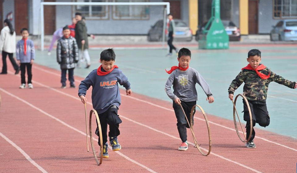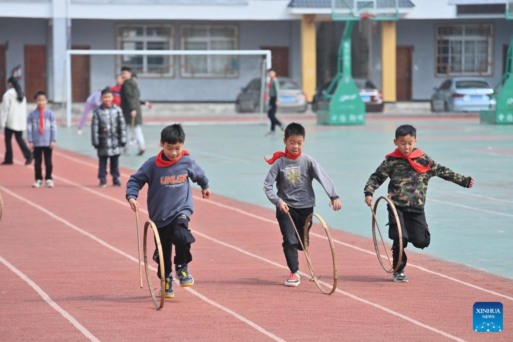 Students roll bamboo rings during a PE class at Xiayi Ethnic School in Mengshan County of Wuzhou City, south China's Guangxi Zhuang Autonomous Region, Feb. 22, 2023. (Xinhua/Huang Xiaobang)