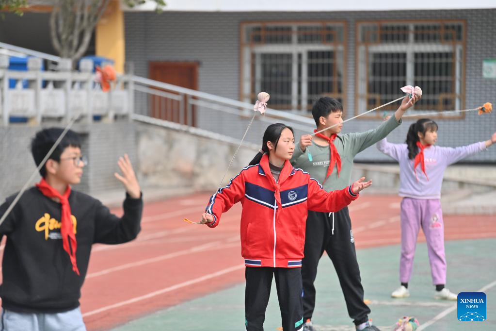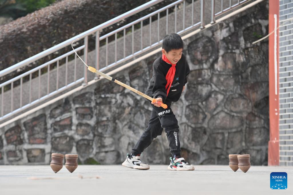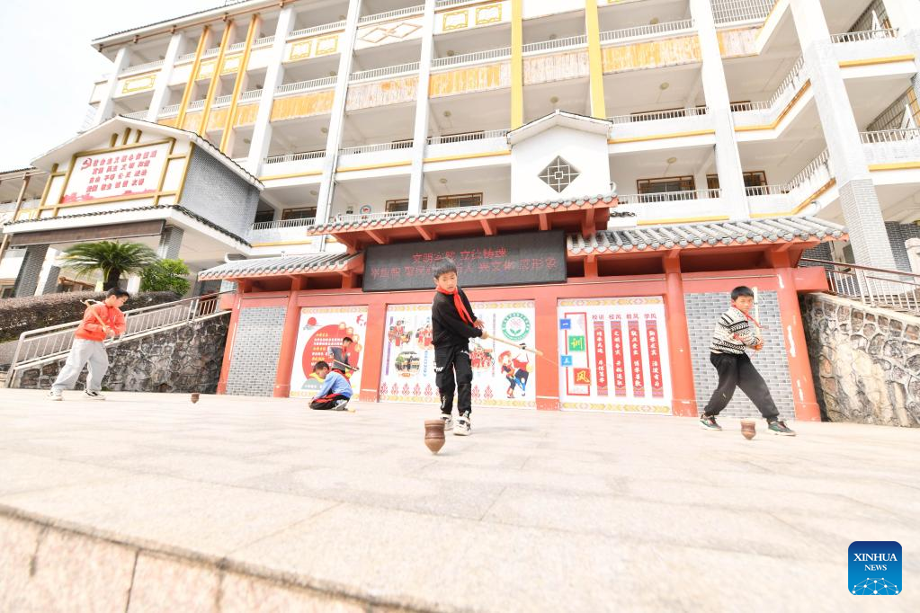 Students play spinning tops during a PE class at Xiayi Ethnic School in Mengshan County of Wuzhou City, south China's Guangxi Zhuang Autonomous Region, Feb. 22, 2023. (Xinhua/Huang Xiaobang)