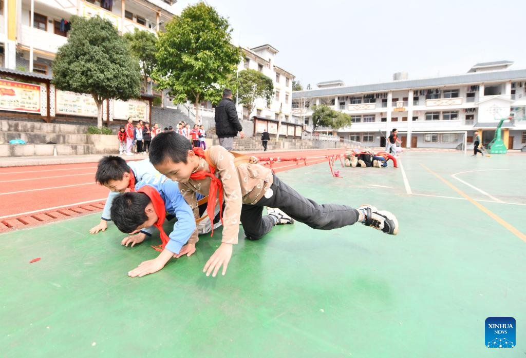 Students take part in a tug-of-war game during a PE class at Xiayi Ethnic School in Mengshan County of Wuzhou City, south China's Guangxi Zhuang Autonomous Region, Feb. 22, 2023. (Xinhua/Huang Xiaobang)