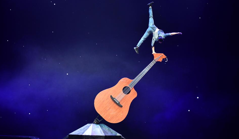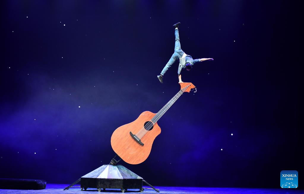 An actor performs acrobatics on stage during the gala show of the 11th China Acrobatic Exhibition in Jinan, east China's Shandong Province, March 27, 2023. The 11th China Acrobatic Exhibition has been held from March 16 to 29 in Shandong. This year's event features a series of acrobatic and magic shows as well as acrobatic dramas. (Xinhua/Xu Suhui)