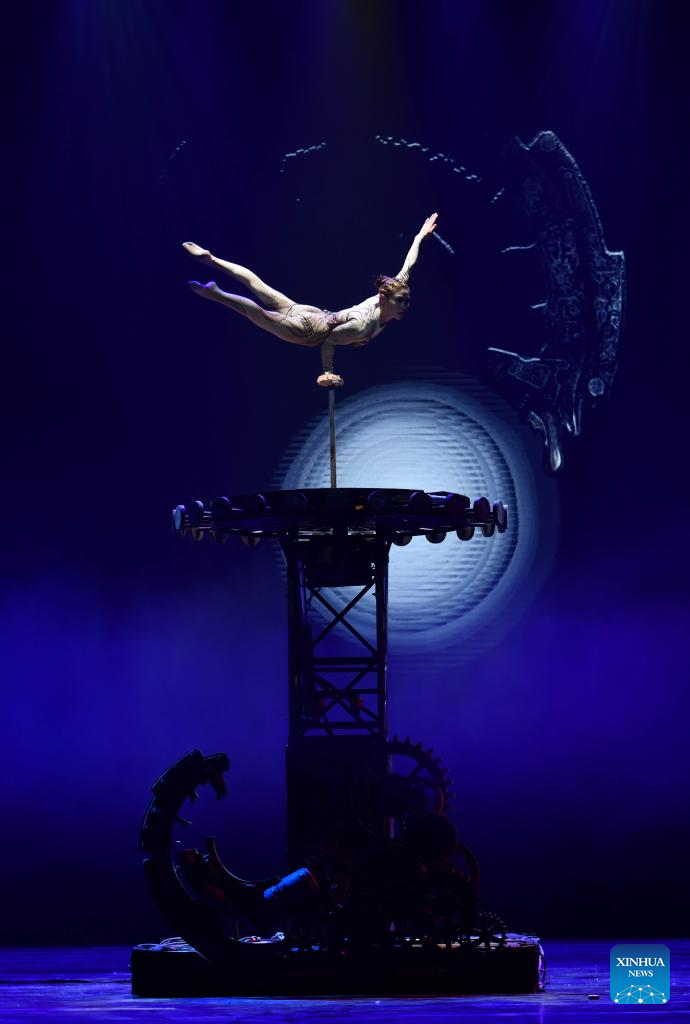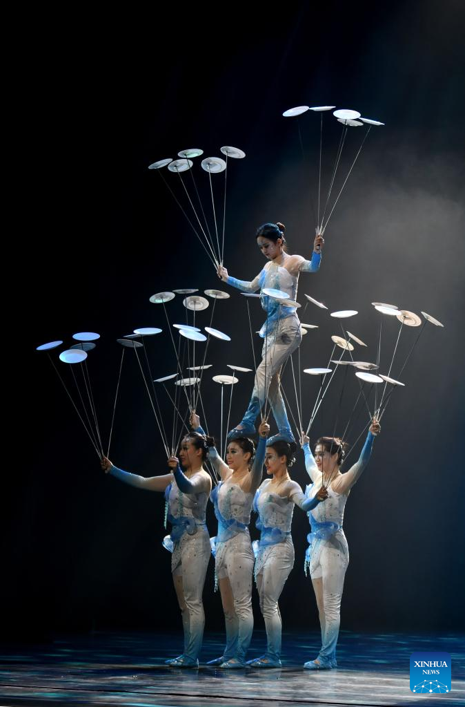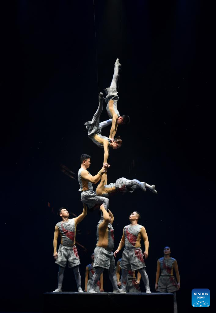 Actors perform acrobatics on stage during the gala show of the 11th China Acrobatic Exhibition in Jinan, east China's Shandong Province, March 27, 2023. The 11th China Acrobatic Exhibition has been held from March 16 to 29 in Shandong. This year's event features a series of acrobatic and magic shows as well as acrobatic dramas. (Xinhua/Xu Suhui)