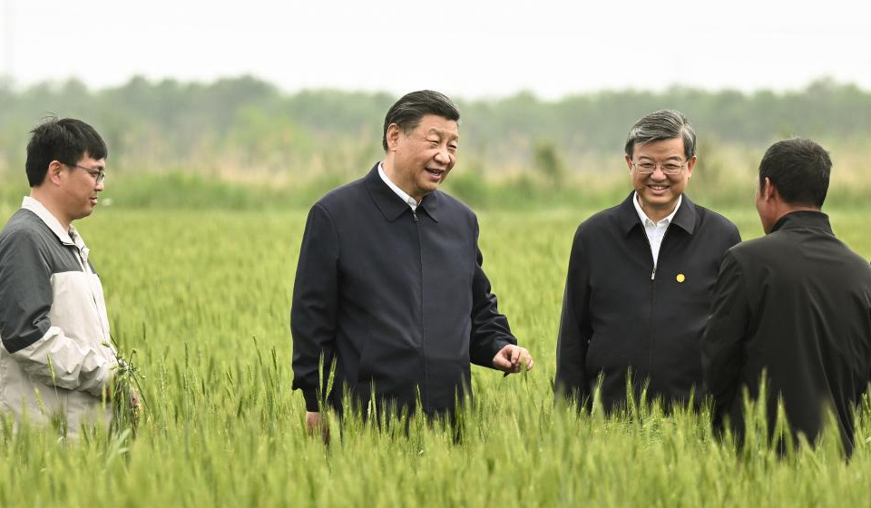 Chinese President Xi Jinping, also general secretary of the Communist Party of China Central Committee and chairman of the Central Military Commission, learns about the cultivation of crops tolerant of drought and alkalinity in a wheat field in Cangzhou, north China's Hebei Province, May 11, 2023. Xi on Thursday visited the city of Cangzhou in north China's Hebei Province. (Xinhua/Yin Bogu)