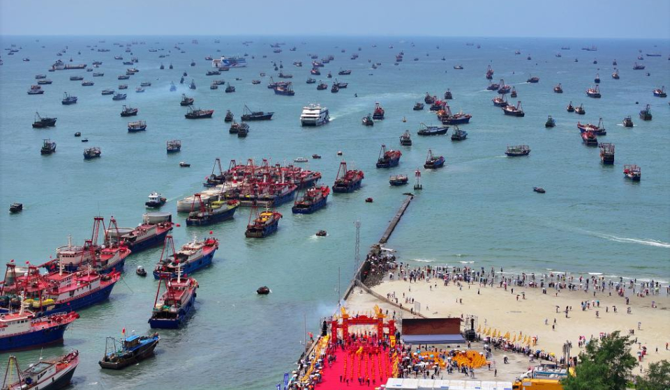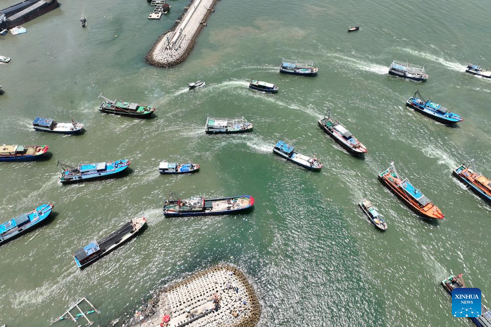 This aerial photo taken on Aug. 16, 2023 shows fishing boats sailing off from the Zhapo fishing port in Yangjiang City, south China's Guangdong Province. The fishing season of the South China Sea started Wednesday after this summer's three-and-half-month fishing ban. (Xinhua/Huang Guobao)