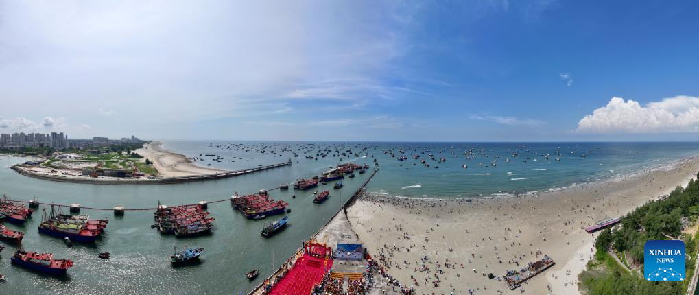 This aerial photo taken on Aug. 16, 2023 shows fishing boats sailing towards the South China Sea from the Xinying port in Lingao County, south China's Hainan Province. The fishing season of the South China Sea started Wednesday after this summer's three-and-half-month fishing ban. (Xinhua/Zhang Liyun)