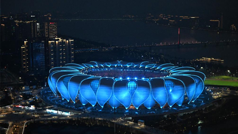 This photo taken on Oct. 8, 2023 shows a view of the Hangzhou Olympic Sports Center Stadium before the closing ceremony of the 19th Asian Games in Hangzhou, east China's Zhejiang Province. (Xinhua/Yan Linyun)
