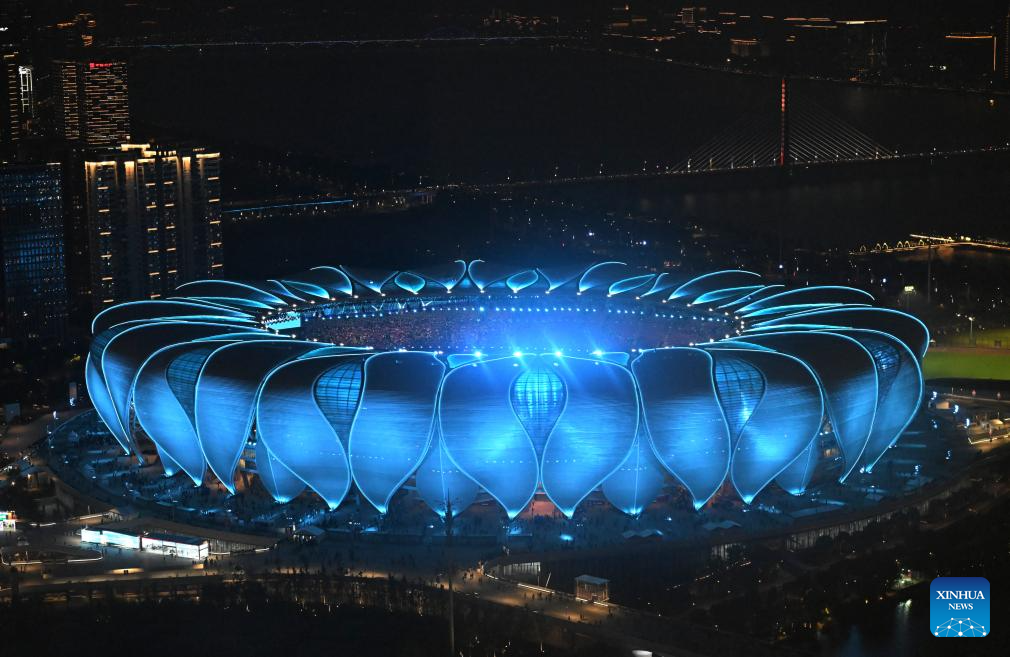 This photo taken on Oct. 8, 2023 shows a view of the Hangzhou Olympic Sports Center Stadium before the closing ceremony of the 19th Asian Games in Hangzhou, east China's Zhejiang Province. (Xinhua/Meng Chenguang)