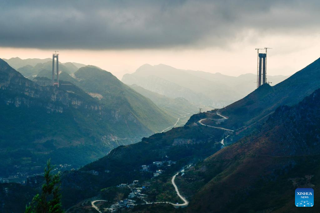 This photo taken on Nov. 7, 2023 shows the two main towers of the Huajiang grand canyon bridge in southwest China's Guizhou Province.