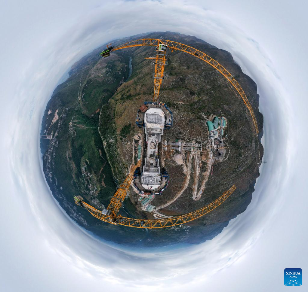 This aerial panoramic photo taken on Nov. 8, 2023 shows the construction site of the Huajiang grand canyon bridge in southwest China's Guizhou Province.