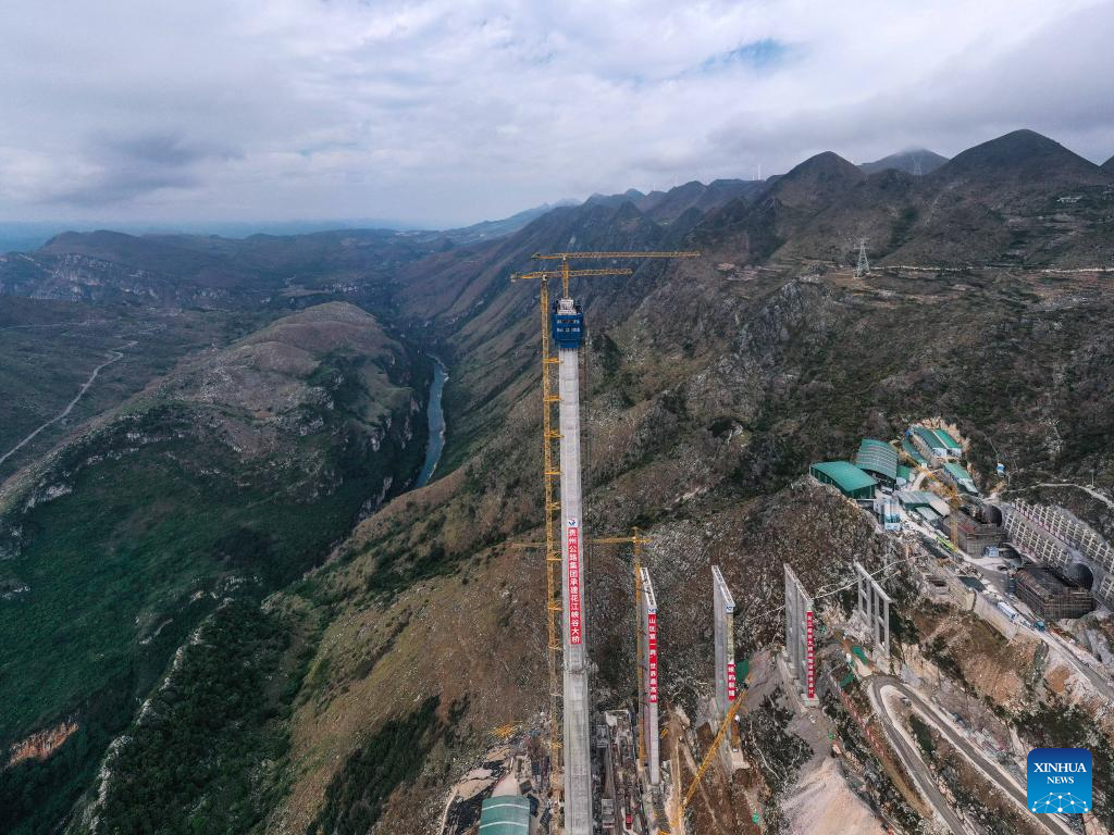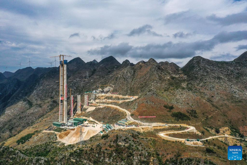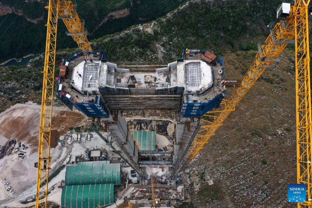 The main towers of the Huajiang grand canyon bridge have been successfully capped recently. With a designed height of 625 meters between the bridge deck and the Beipanjiang River below, the Huajiang grand canyon bridge is set to be the highest in the world after it is completed in 2025. (Xinhua/Yang Wenbin)