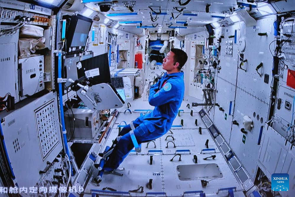 This screen image captured at Beijing Aerospace Control Center on May 28, 2024 shows Shenzhou-18 astronaut Li Guangsu returning to space station after extravehicular activities. The Shenzhou-18 crew members on board China's orbiting space station completed their first spacewalk on Tuesday, according to the China Manned Space Agency. (Xinhua/Li Jie)