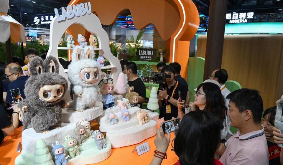 People visit a booth of Pop Mart during the 2025 China International Fair for Trade in Services (CIFTIS) in Beijing, capital of China, Sept. 10, 2025. The 2025 CIFTIS opened in Beijing on Wednesday, themed "Embrace Intelligent Technologies, Empower Trade in Services." (Xinhua/Zhang Chenlin)