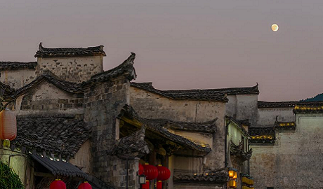 This aerial drone photo taken on Oct. 5, 2025 shows the moon at Hongcun Village of Yixian County, Huangshan City, east China's Anhui Province. Yixian County is noted for its "lantern gala," an important folk event held during traditional festivals. (Photo by Wang Cheng/Xinhua)