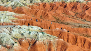 Photo taken on October 7, 2025, shows the northern Hongya Plateau in Siziwang Banner, Ulanqab City, Inner Mongolia, dyed with rich hues by the autumn wind. Its magnificent scenery attracts streams of visitors. (Wang Zheng/Guangming Pictures)