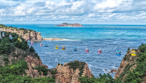 Photo taken on October 7, 2025, shows tourists riding the cross-sea cableway in the Chengshantou Scenic Area of Rongcheng City, east China’s Shandong Province. (Li Xinjun/Guangming Pictures)