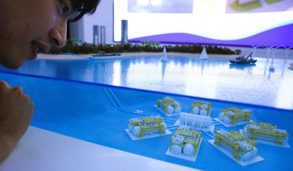 A visitor observes a miniature model of undersea data cabins for an undersea data center, in Lingshui, south China's Hainan Province, Sept. 25, 2025. (Xinhua/Zheng Yue)