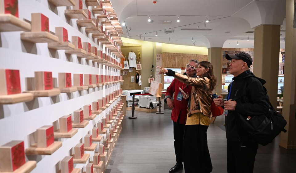 An international guest visits the Dunhuang Press in Dunhuang, northwest China's Gansu Province, Oct. 11, 2025. From October 11 to 12, guests from Armenia, Italy, Turkey, Nepal, and other countries attending the Global Mayors Dialogue -- Dunhuang event visited cultural landmarks in Dunhuang, experiencing the historical charm of the city. (Xinhua/Zhang Rui)