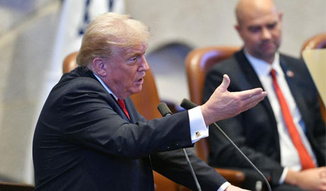 U.S. President Donald Trump addressed the Israeli parliament, the Knesset, in Jerusalem during a brief visit as the Israel-Hamas ceasefire entered its fourth day, hailing an "end" to Israel's two-year war in Gaza, Oct. 13, 2025. Trump's speech was briefly interrupted when a Knesset member displayed a sign calling for the recognition of Palestine on Monday. (JINI via Xinhua)