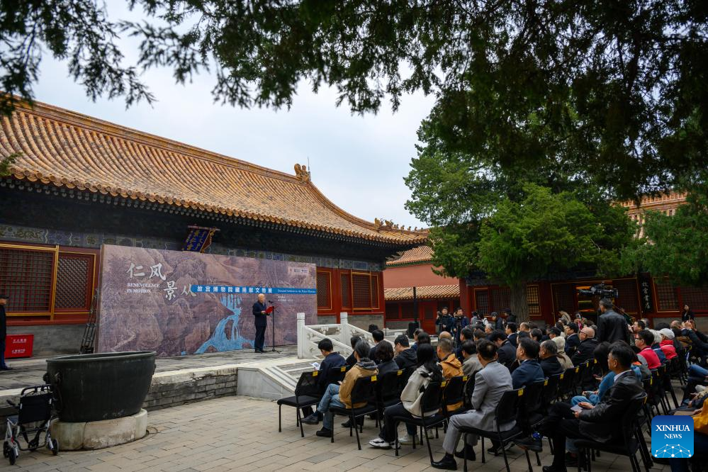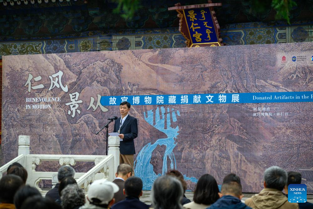 This photo taken on Oct. 16, 2025 shows the opening ceremony of the "Benevolence in Motion: Donated Artifacts in the Palace Museum" exhibition in Beijing, capital of China. The expo kicked off here on Thursday. (Xinhua/Jin Liangkuai)