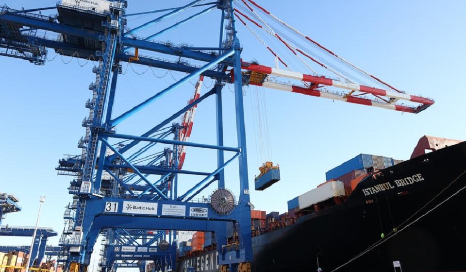 The vessel began berthing at the Baltic Hub Terminal before 6 a.m., slightly delayed due to sea conditions, and loading and unloading operations commenced around 7 a.m., according to port authorities.