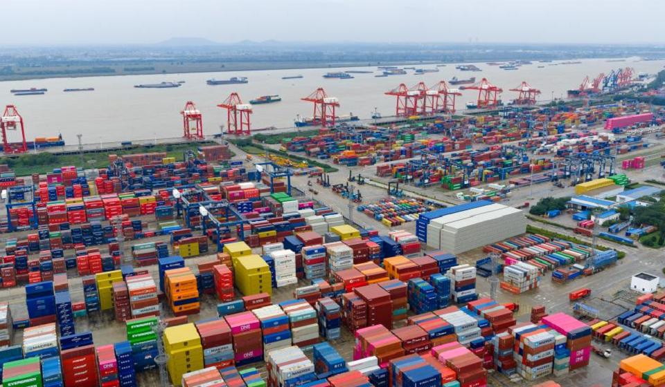 An aerial drone photo shows the view of a container terminal of Nanjing Port in east China's Jiangsu Province, Oct. 19, 2025. China's gross domestic product (GDP) grew 5.2 percent year on year in the first three quarters of 2025, data from the National Bureau of Statistics (NBS) showed Monday. (Photo by Yang Suping/Xinhua)