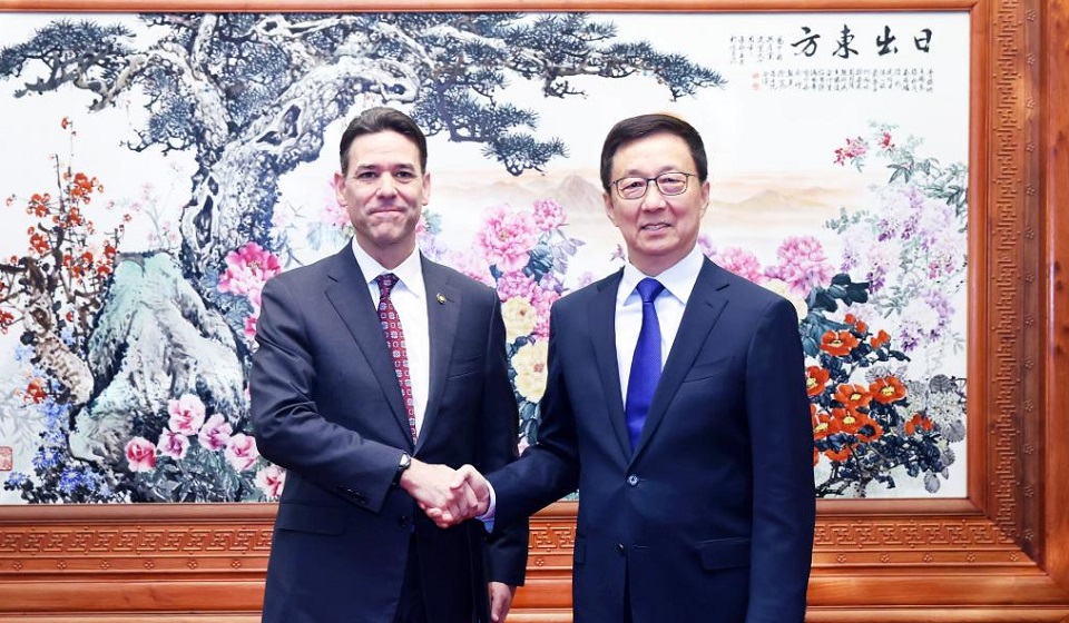 Chinese Vice President Han Zheng meets with Rob Wagner, president of the United States' Oregon State Senate, in Beijing, capital of China, Oct. 21, 2025. (Xinhua/Liu Weibing)