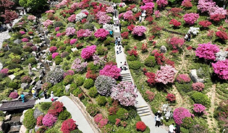An aerial drone photo shows people admiring blossoms at a scenic spot in Deqing County, east China's Zhejiang Province, April 13, 2025. (Photo by Xie Shangguo/Xinhua)