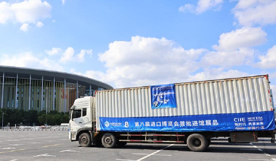 A truck loaded with exhibits for the upcoming 8th China International Import Expo (CIIE) is seen during a ceremony marking the arrival of exhibits at the National Exhibition and Convention Center (Shanghai), the main venue for the CIIE, in east China's Shanghai, Oct. 23, 2025. The first batch of exhibits for the exhibition areas of Intelligent Industry and Information Technology, Food and Agricultural Products, and Medical Equipment &Healthcare Products of the 8th CIIE arrived at the National Exhibition and Convention Center (Shanghai) on Thursday. (Xinhua/Fang Zhe)