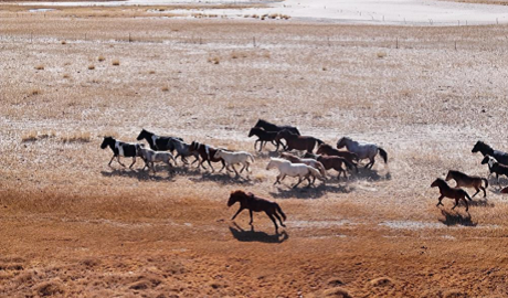An aerial drone photo taken on Oct. 23, 2025 shows horses galloping on a grassland in the Kazak Autonomous County of Aksay, northwest China's Gansu Province. (Photo by Gao Hongshan/Xinhua)