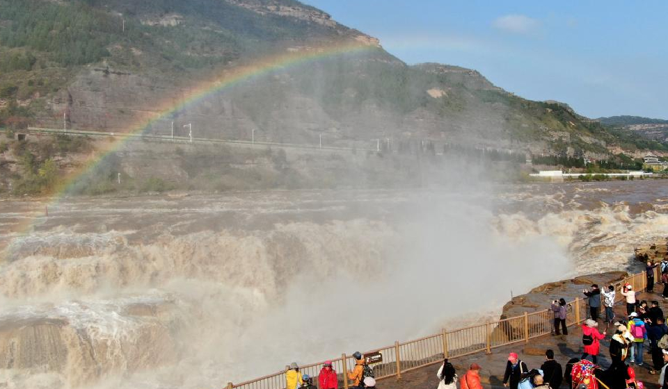 Tourists take photos of a rainbow over the Hukou Waterfall in Jixian County, north China's Shanxi Province, Oct. 27, 2025. (Photo by Lyu Guiming/Xinhua)