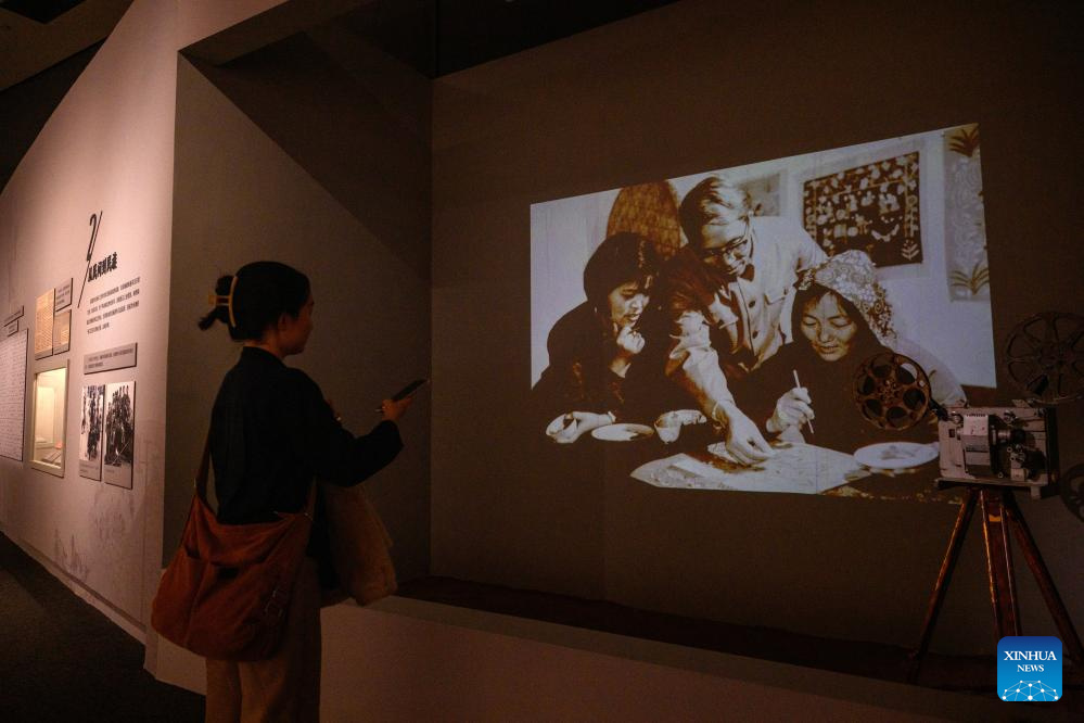 A woman takes photos at the "Colorful Brushstrokes upon the Earth: the 2025 Chinese Farmers' Paintings Exhibition" at the National Museum of China in Beijing, capital of China, Oct. 28, 2025. The exhibition opened here on Tuesday. (Xinhua/Jin Liangkuai)