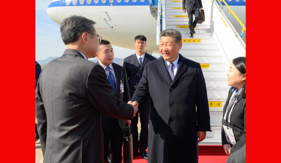 Upon arriving at Busan's Gimhae International Airport, Xi was warmly welcomed by senior South Korean officials, including Foreign Minister Cho Hyun. A 21-gun salute was fired at the airport.