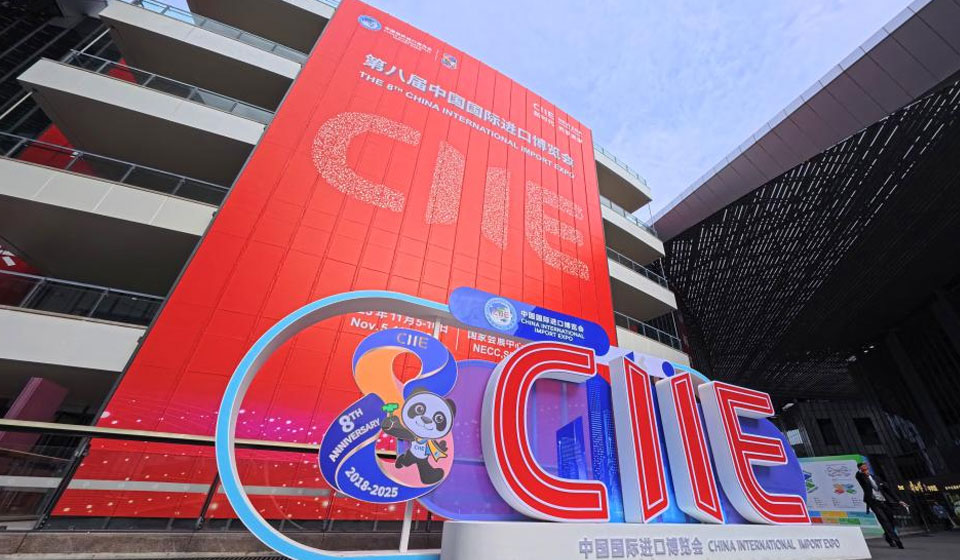 This photo taken on Nov. 3, 2025 shows a themed-decoration of the China International Import Expo (CIIE) at the National Exhibition and Convention Center (Shanghai) in east China's Shanghai. The eighth CIIE will be held in Shanghai from Nov. 5 to 10. The event this year will feature 4,108 overseas exhibitors from 155 countries, regions and international organizations, with the total exhibition area exceeding 430,000 square meters, setting a new record in scale. (Xinhua/Fang Zhe)
