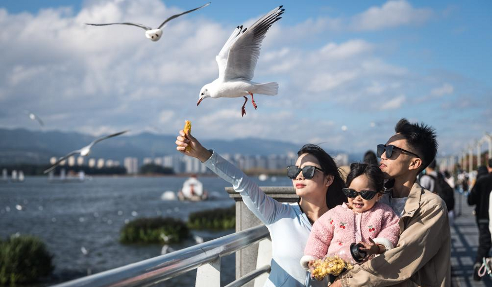 Tourists feed black-headed gulls at the Haigeng Dam in Kunming, southwest China's Yunnan Province, Nov. 10, 2025. Black-headed gulls migrate to Kunming for the warm weather there in winter. (Xinhua/Wang Guansen)