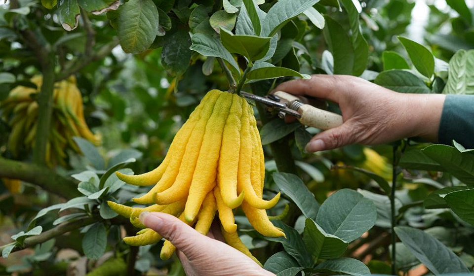 A worker picks a fingered citron in Bailongqiao Town of Wucheng District, Jinhua City of east China's Zhejiang Province, on Nov. 11, 2025. Jinhua fingered citron, a characteristic agricultural product of Jinhua City, has recently entered the harvest season. (Xinhua/Weng Xinyang)