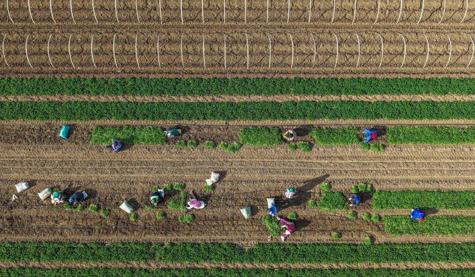 An aerial drone photo taken on Nov. 19, 2025 shows farmers harvesting vegetables in Hezhou, south China's Guangxi Zhuang Autonomous Region. (Photo by Liao Zuping/Xinhua)