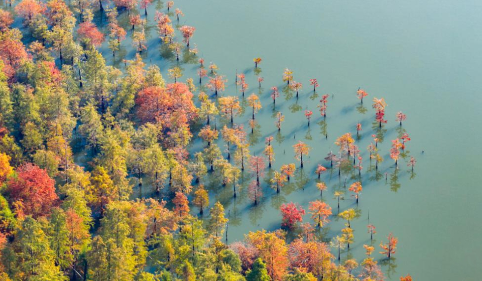 An aerial drone photo taken on Nov. 20, 2025 shows a view of a park in Jinhua, east China's Zhejiang Province. (Photo by Shi Kuanbing/Xinhua)