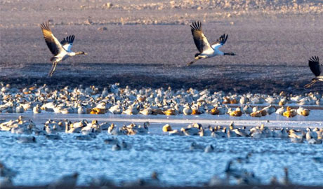 This photo taken on Nov. 23, 2025 shows migratory birds in Lhunzhub County of Lhasa, southwest China's Xizang Autonomous Region. (Xinhua/Jiang Fan)