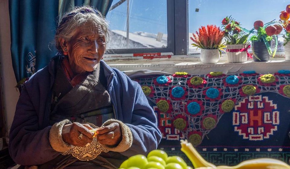 A senior villager sits at her new house in Qaba Village of Dingri County, Xigaze City, southwest China's Xizang Autonomous Region, Nov. 13, 2025. (Xinhua/Jiang Fan)