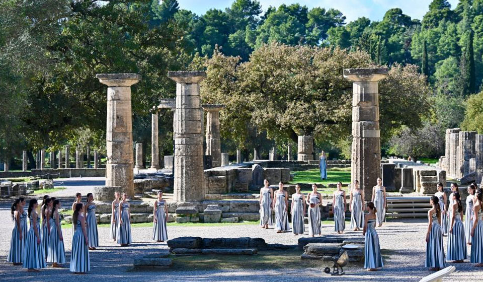 Actresses playing the role of ancient priestesses perform during the dress rehearsal of the Olympic flame lighting ceremony for the Milan-Cortina 2026 Winter Olympic Games in Ancient Olympia, Greece, on Nov. 24, 2025. (Xinhua/Li Jing)