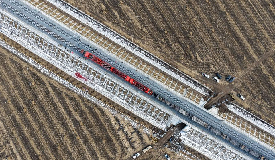 An drone photo taken on Nov. 25, 2025 shows constructors working at a construction site of the Harbin-Yichun high-speed railway in Qing'an County, northeast China's Heilongjiang Province. Track-laying for the Harbin-Yichun high-speed railway completed on Tuesday. The Harbin-Yichun high-speed railway is China's northernmost high-speed railway under construction. (Xinhua/Wang Song)